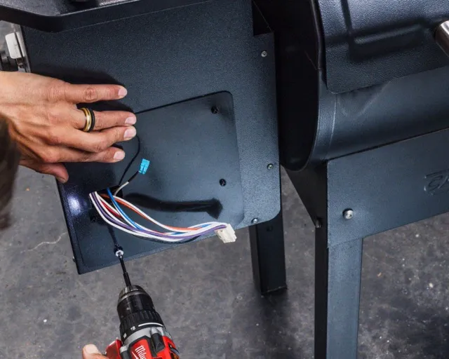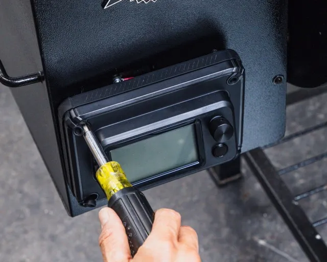 Unscrew the existing controller from the grill and save the mounting screws for reuse.