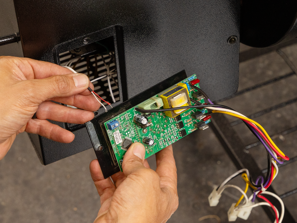 If your pellet smoker uses a different connection method, you can simply cut the wires from the connection. You will need to strip the fiberglass insulation from the wires prior to installing into the provided blue connector. Set the old controller aside as it is no longer needed.