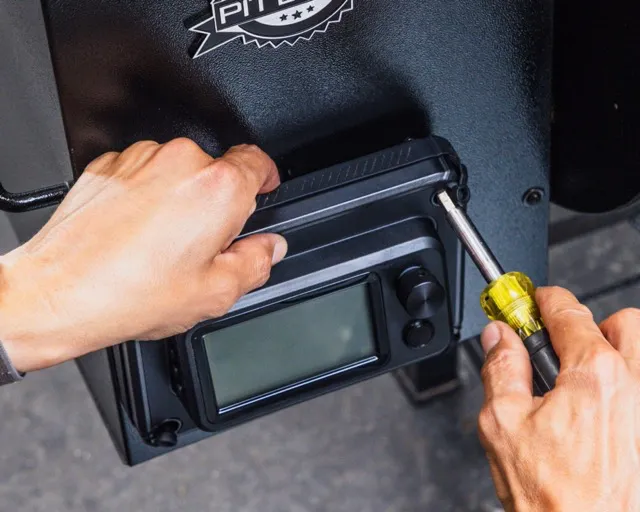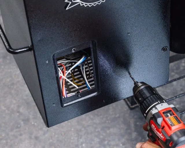 Using a Phillips screwdriver, attach the Pellet Drive to the pellet smoker making sure no wires are trapped under the gasket of the Pellet Drive.