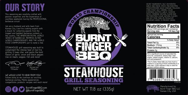 The newest addition to the Burnt Finger family of products. Steakhouse Grill Seasoning was built to compliment the intense heat of live fire grilling. It loves char, and packs the bold flavors of garlic, onion and black pepper. Use on meats, veggies, fish and more!